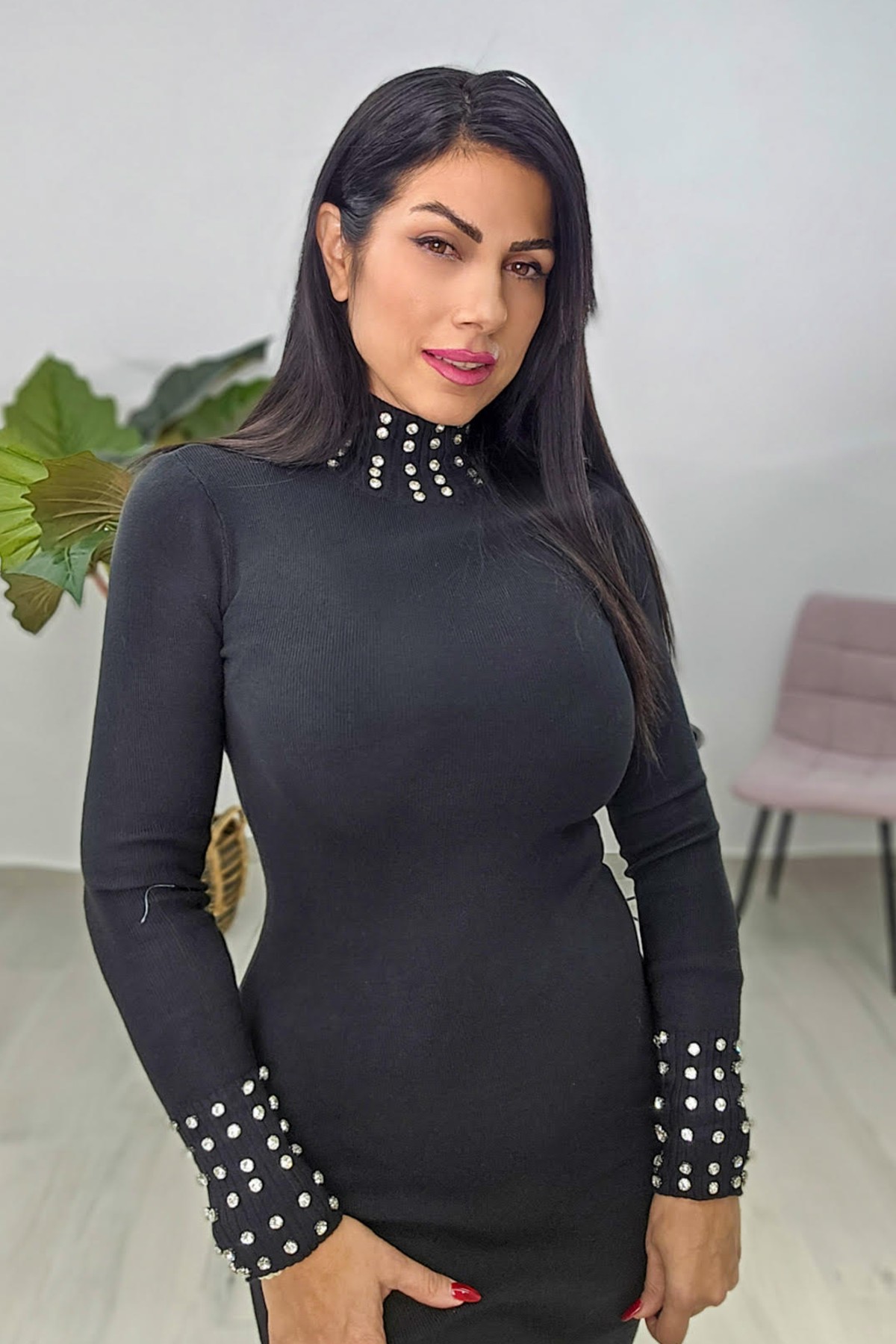Mini φόρεμα από ελαστική πλεκτή βισκόζη. Το φόρεμα έχει άνετη εφαρμογή ,μακρύ μανίκι και λεπτομέρειες με srtass στο λαιμό και στο τελείωμα στα μανίκια.