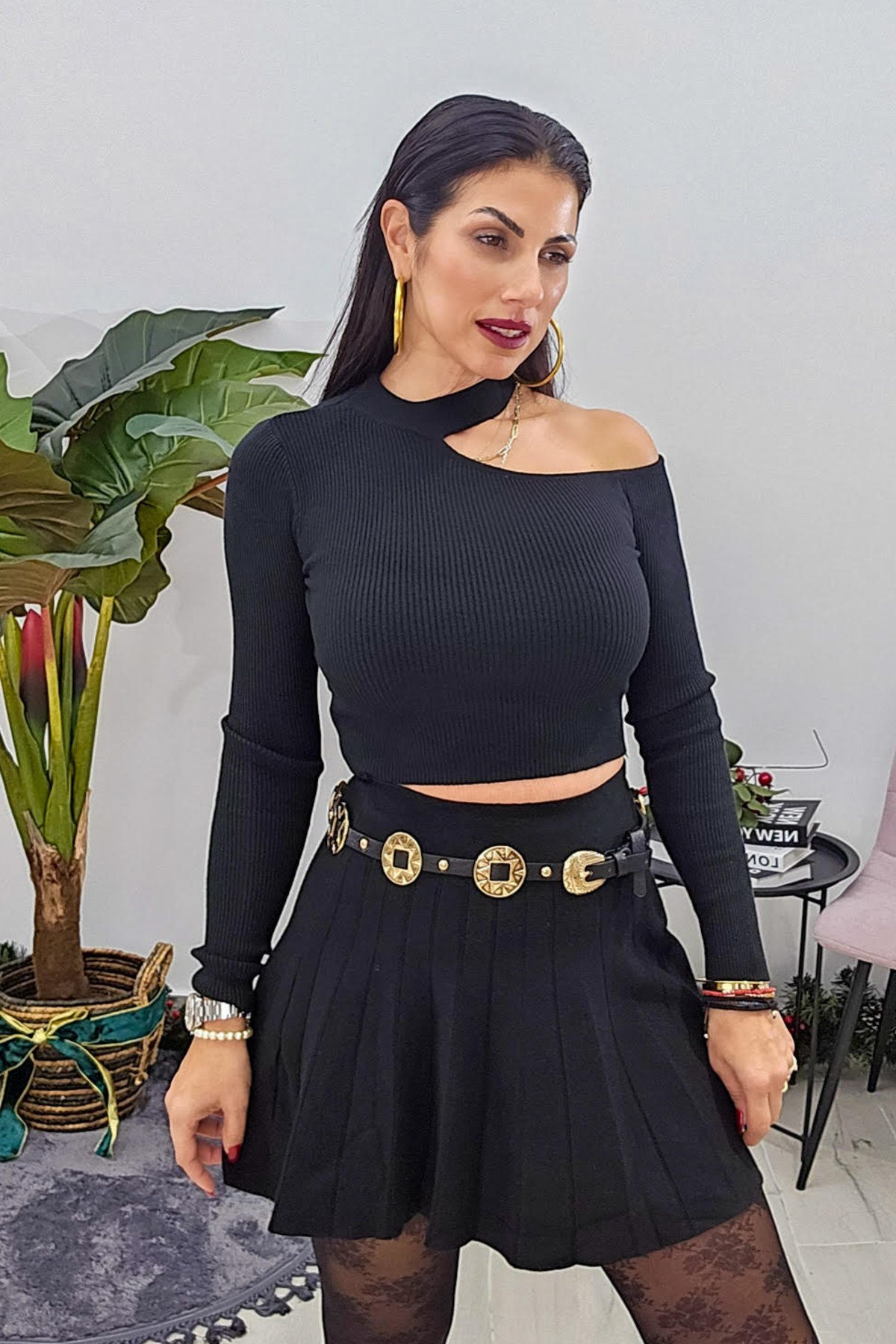 Mini φούστα από ελαστικό πλεκτό ύφασμα. Η φούστα είναι σε άνετη εφαρμογή , έχει μαλακό ύφασμα και ελαστική μέση, είναι πλισέ και το σχέδιο της κάνει A άνοιγμα.