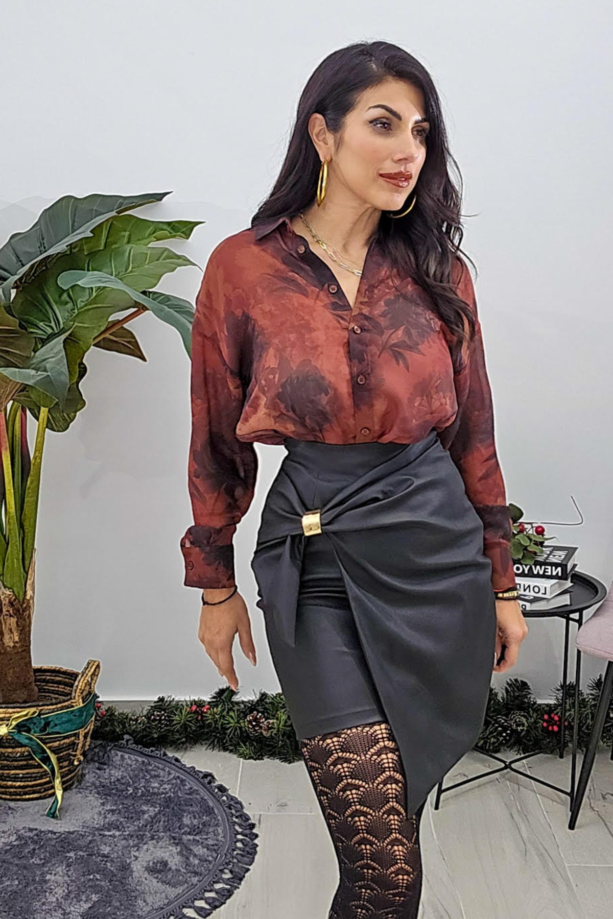 Mini φούστα από ελαστική δερματίνη. Η φούστα είναι σε άνετη εφαρμογή, ψηλόμεση και κλείνει με φερμουάρ στην μέση. Έχει πιέτες από διπλό ύφασμα στην κοιλιά και καταλήγει σε εντυπωσιακό σχέδιο με χρυσό κόσμημα. Το προϊόν είναι ελληνικής εταιρείας.