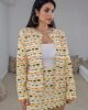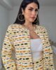 Set φούστα και σακάκι από σταθερό πικέ ζακάρ ύφασμα. Το σακάκι είναι σε άνετη εφαρμογή με μακρύ μανίκι, κλείνει μπροστά με κουμπιά χρυσά εντυπωσιακά. Η φούστα είναι στενή και μίνι πάνω στο σώμα, έχει λάστιχο πίσω στην μέση . Το προιόν είναι ελληνικής εταιρείας.