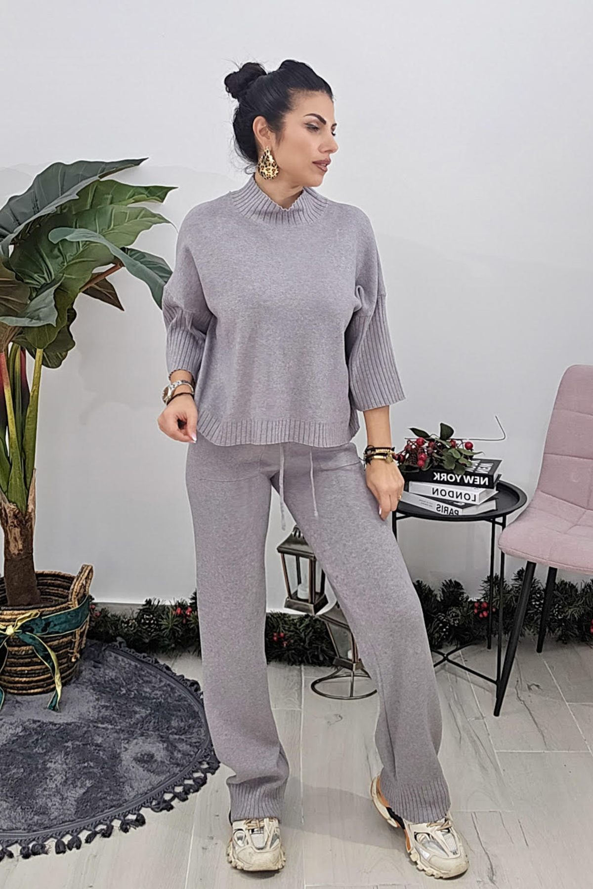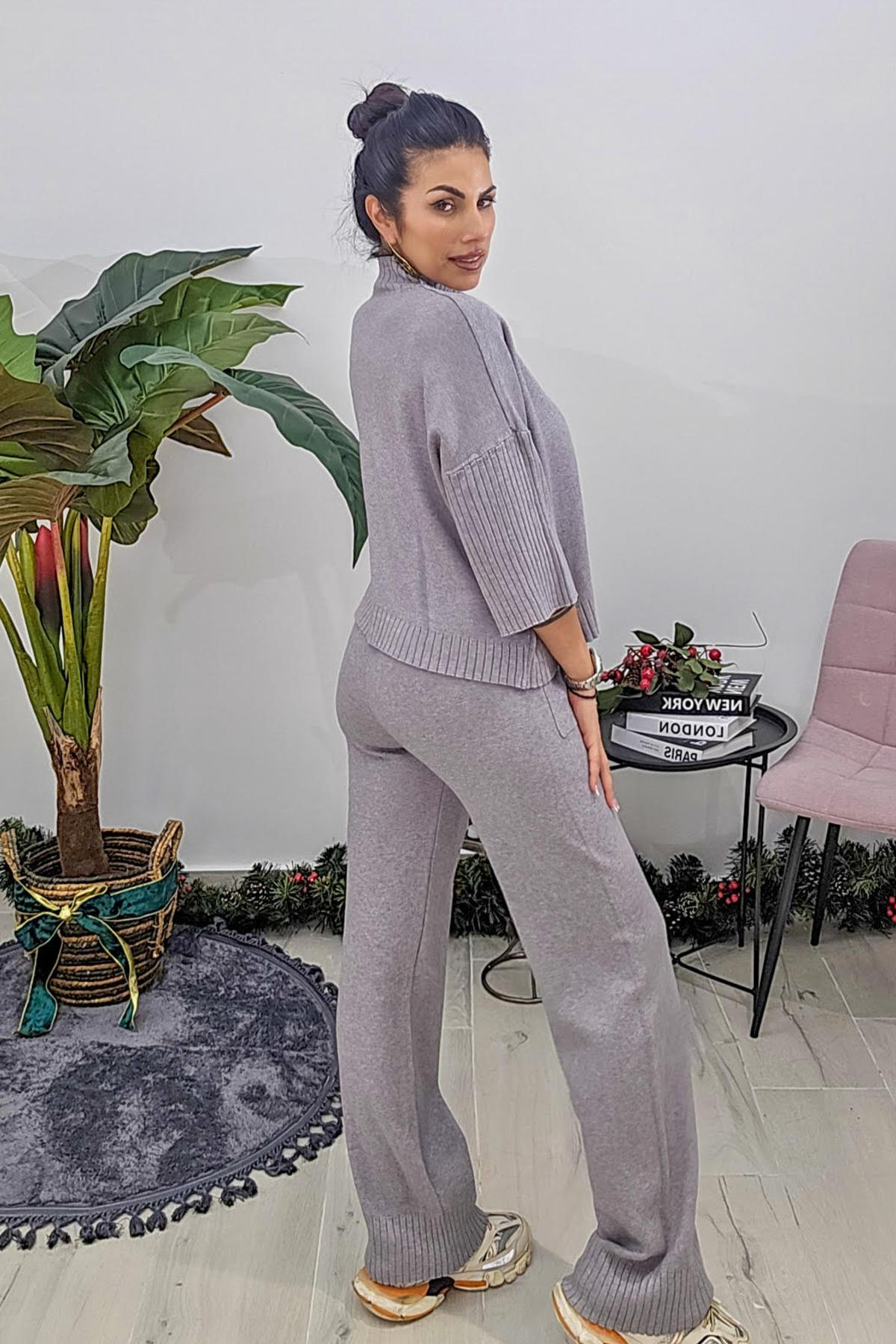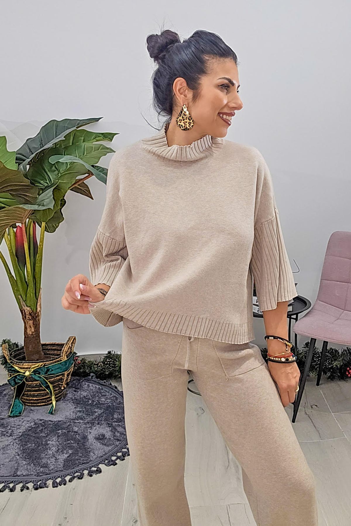 Πλεκτό σετ παντελόνι και μπλούζα από ελαστική βισκόζη. Το σετ είναι σε άνετη εφαρμογή με λάστιχο στην μέση ριπ τελειώματα στα πατζάκια στα μανίκια και στον λαιμό, κορδόνι που σφίγγει στο παντελόνι, τσέπες εμφανείς και μαλακή υφή.